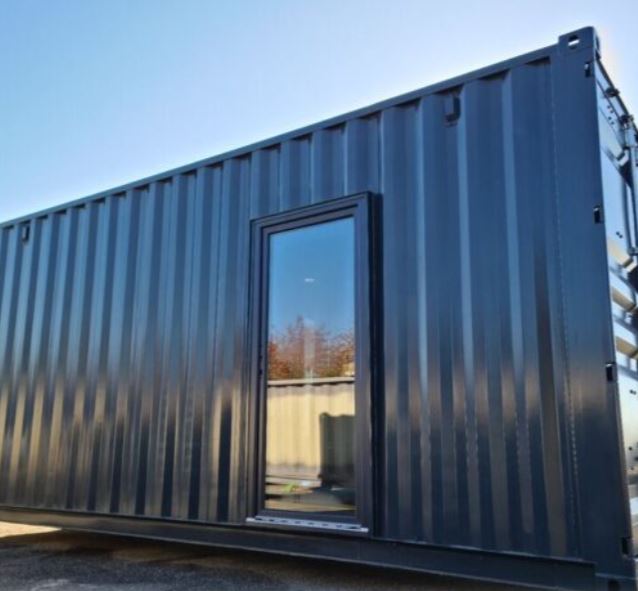 The industrial look combined with wood and glass gives the container sauna a modern appearance that blends well into various landscapes.